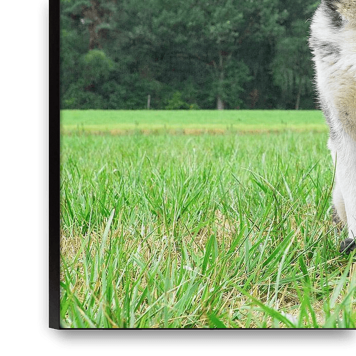Bestelle dieses Landschafts-Wandbild Vier Schlittenhunde sitzen auf grüner Wiese nebeneinander von Ben Schonewille als Reproduktion auf Leinwand, Alu-Dibond, als Poster, Fototapete oder Acrylglasbild.
