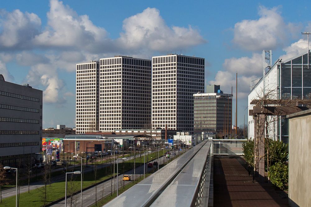 Zicht op Marconiplein vanaf het dakpark in de Vierhavenstraat
