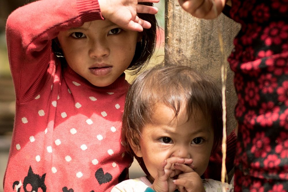 Auf diesem Foto stehen zwei junge vietnamesische Mädchen neben ihrer Mutter, ihre Augen spiegeln eine tiefe Unschuld und Verwunderung wider. Sie scheinen vom Konzept des Tourismus oder der modernen Technologie unberührt zu sein. Ihre Welt ist geprägt von den Rhythmen des ländlichen Lebens und den über Generationen weitergegebenen Traditionen.