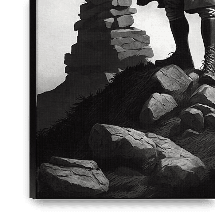 Ein sehr detailliertes digitales Schwarz-Weiß-Gemälde, das einen alten Mann in viktorianischer Kleidung darstellt, der auf einem schroffen Gipfel steht. Er trägt schwarze Stiefel, hat weißes Haar und raue Bartstoppeln im Gesicht, die ein Gefühl von Weisheit und Einsamkeit vermitteln. Hinter ihm markieren Steinhaufen den Weg, während…