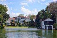 Während einer Bootstour in Winter Park, Florida, bewunderten wir die vielen schönen Villen, die an den Ufern des Lake Osceola, Lake Virginia und Lake Maitland gebaut wurden. Dies hier ist ein Herrenhaus im toskanischen Stil am Lake Maitland, Winter Park, Florida.