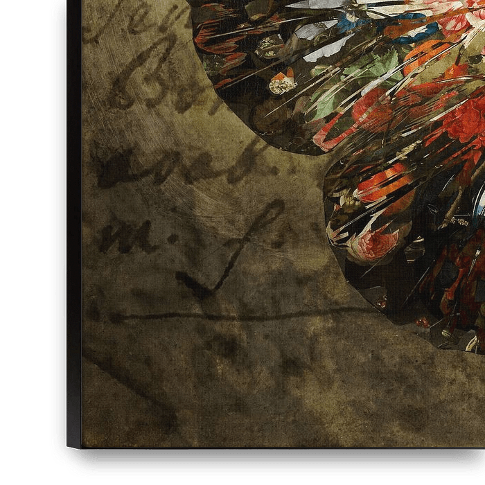 Eine Schmetterlingsillustration, bedeckt mit einer Collage aus wunderschönen, detailliert gemalten Vintage-Blumen, ist auf altem Papier mit Tintenhandschrift überlagert. Kannst du den winzigen Aurorafalter entdecken, der sich zwischen den Blumen versteckt?