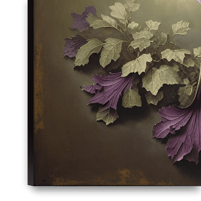 Ein digitales Kunstwerk mit verschnörkelten Blumen und einem Hintergrund in gemalten Farben. Für eine botanische und Vintage-Atmosphäre in Ihrem Interieur.