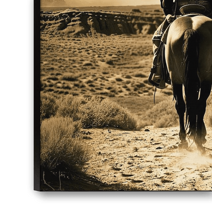 Tauchen Sie Ihren Raum in die ikonische Atmosphäre des amerikanischen Wilden Westens mit diesem atemberaubenden Wandbild ein. Das Kunstwerk zeigt einen Cowboy auf einem Pferd, der durch eine atemberaubende Wüstenlandschaft reitet, umgeben von imposanten Felsformationen und einem dramatisch bewölkten Himmel. Die Sepia-Töne verleihen dem Bild ein Vintage-Gefühl, perfekt für Fans von Western und Americana. Diese Wanddekoration bringt ein Gefühl von Abenteuer und Freiheit in Ihr Wohnzimmer, Arbeitszimmer oder Büro und weckt den Geist des Wilden Westens.