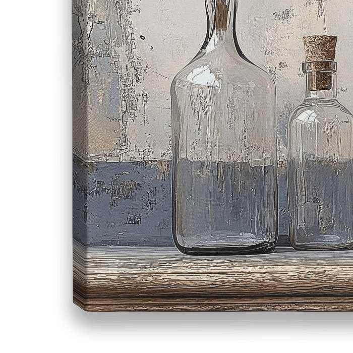 Eine poetische Stilllebenstudie über Vergänglichkeit und natürliche Schönheit, vereint in einer klassischen Umgebung aus getrockneten Disteln in einer Steingutvase, umgeben von staubigen Glasflaschen vor einer verwitterten und verfärbten Wand – ein meisterhaft zeitloser Ausdruck der flüchtigen Eleganz des Lebens.