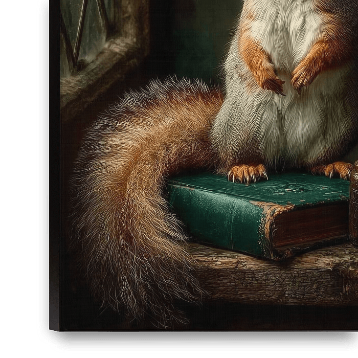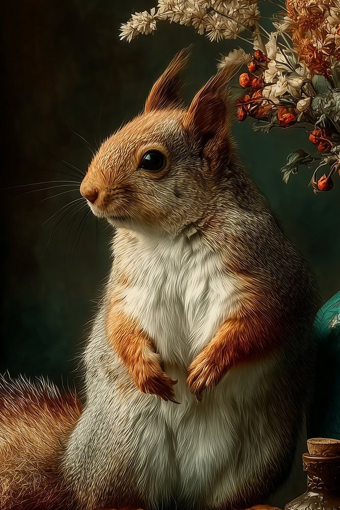 Bringen Sie einen Hauch von Zauber in Ihr Interieur mit diesem einzigartigen Kunstwerk, in dessen Zentrum ein anmutiges Eichhörnchen steht. Das Gemälde kombiniert warmes, klassisches Licht mit reichen Details: vom weichen, flauschigen Eichhörnchenfell über die sorgfältig arrangierten Trockenblumen bis hin zum verwitterten alten Buch,…