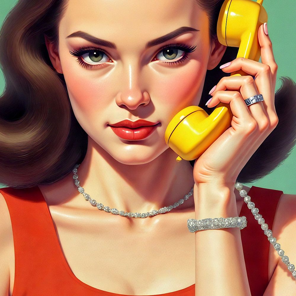 Bestelle dieses Popart-Wandbild Vintage Glamour Frau mit Telefon von Jan Keteleer als Reproduktion auf Leinwand, Alu-Dibond, als Poster, Fototapete oder Acrylglasbild.
