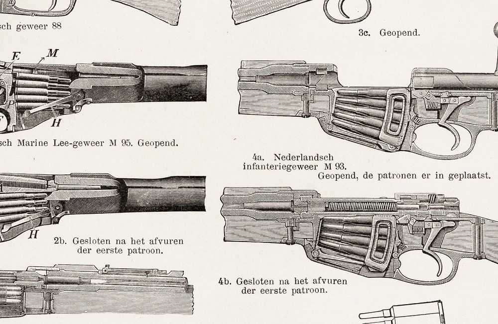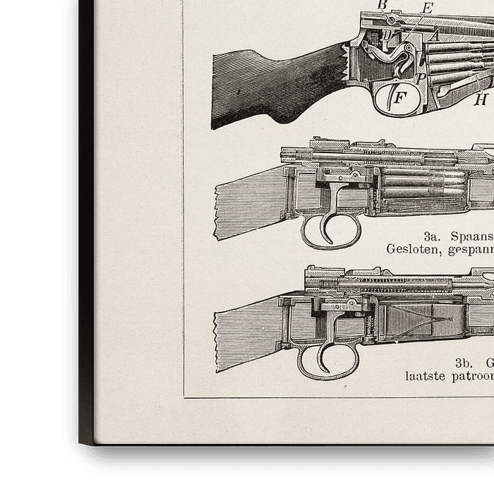 Dieser antike Druck aus der Zeit um 1900 zeigt eine große Anzahl von Querschnitten und offenen Modellen verschiedener Gewehre. Dazu gehören das deutsche Mauser-Gewehr, das amerikanische Lee-Gewehr (M 79) und das niederländische Infanteriegewehr M 71. Wir sehen Beispiele von Patronenlagern und Magazinen in verschiedenen Zuständen.