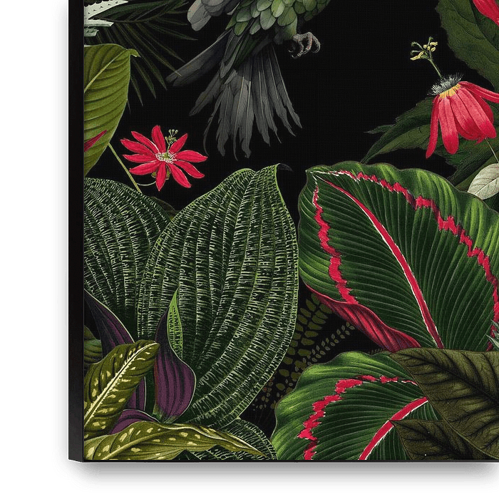 Bestelle dieses Blumen-Wandbild Vintage Midnight Tropischer Dschungel mit exotischen Vögeln 1 von Floral Abstractions als Reproduktion auf Leinwand, Alu-Dibond, als Poster, Fototapete oder Acrylglasbild.