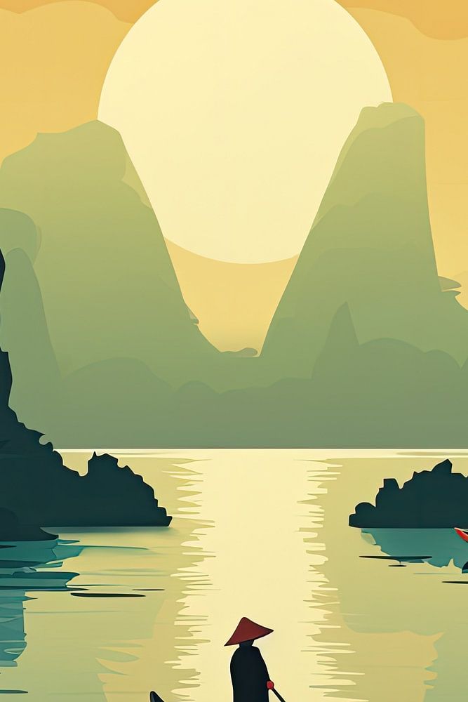 Das Vintage-Reiseplakat von Vietnam verströmt die Atmosphäre einer Zeit, als Reisen noch mit bunten Plakaten an Bahnhöfen und Reisebüros angekündigt wurden. Das Design erinnert an die 1930er bis 1960er Jahre, als der Art-déco-Stil mit seinen klaren Linien und leuchtenden Farben den Ton angab.