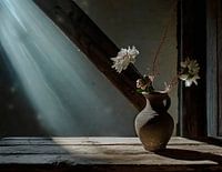 Eine alte Vase mit Blumen und einem Zweig steht auf einem alten Tisch am Fenster, in das das Licht des Mondes scheint. Das Bild wurde mit ai erstellt.