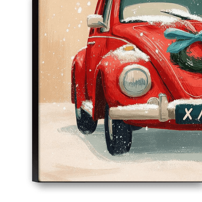 Ein charmanter roter Oldtimer, geschmückt mit einem grünen Weihnachtskranz und einer Schleife, bahnt sich seinen Weg durch den Schnee.