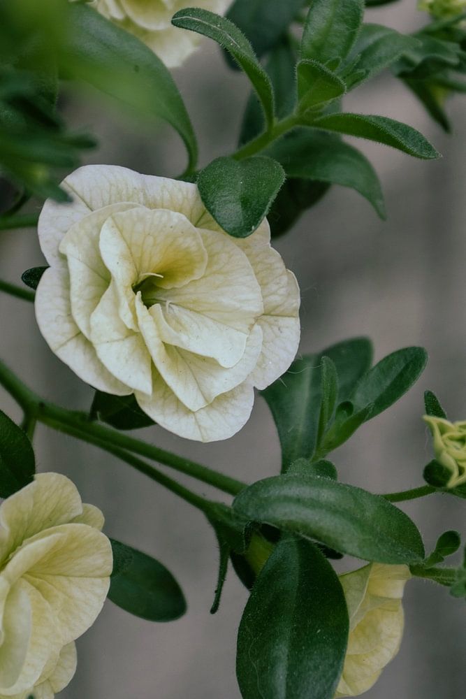 Schöne blassgelbe Petunienblüten mit gekräuselten Blütenblättern blühen inmitten üppiger grüner Blätter. Der Vintage-Ton vermittelt ein sanftes, nostalgisches Gefühl vergangener Tage. Sie sind vor einem sanft verschwommenen Hintergrund aus verwittertem, dunklem Holz in einer natürlichen, rustikalen Umgebung platziert.