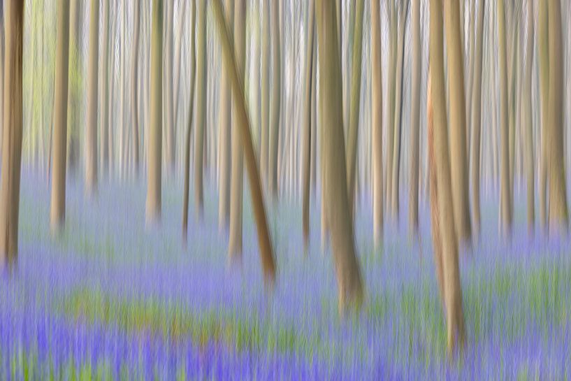 Eine verträumte Atmosphäre liegt über dem Hallerbos, wo sanftes Licht und ein subtiler Dunst die Landschaft einhüllt. Die blauen Blumenteppiche scheinen zwischen den Bäumen zu schweben und verleihen dem Wald eine märchenhafte Ruhe und Tiefe.