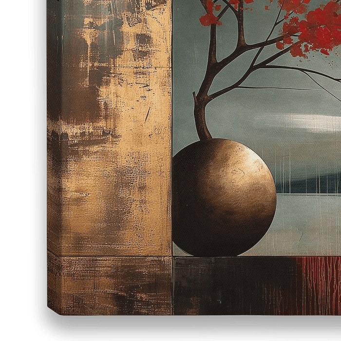 Abstrakte Landschaft im Japandi-Stil mit einer Vase mit roten Blüten und einem Vollmond über Bergen und Meer im Hintergrund.