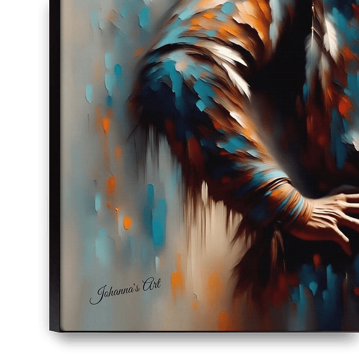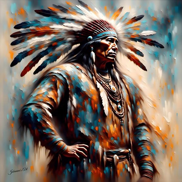 Ein indianischer Mann steht majestätisch in der Mitte der Komposition, geschmückt mit einem farbenprächtigen Federkopfschmuck und einer detailreichen traditionellen Kleidung. Der Kopfschmuck erhebt sich mit Eleganz und Stärke, jede Feder fließt harmonisch und symbolisiert Ehre, Erbe und spirituelle Verbindung. Seine Haltung vermittelt…