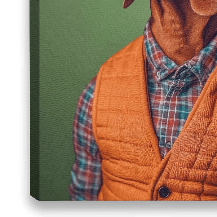 Ein stilvoller Vizsla strahlt Charme und Eleganz aus, mit seinem samtigen, kastanienbraunen Fell, das im Kontrast zu seiner schlichten, modischen Kleidung steht. Der schicke Hut und die orangefarbene Weste verleihen ihm eine außergewöhnliche Persönlichkeit, während seine lebhaften Augen voller Intelligenz und Neugier auf die Welt…