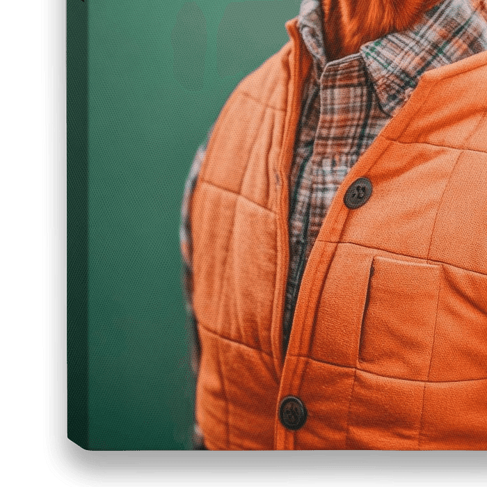 Ein eleganter Vizsla mit leuchtend rotem Fell und einem charmanten Ausdruck trägt eine schicke, beginnende Mode. Der Blick ist stolz und intelligent, während die stylische Kopfbedeckung und die orangefarbene Weste seinen Charakter unterstreichen. Diese einzigartige Kombination aus Canidencharme und menschlichem Stil strahlt ein Gefühl…