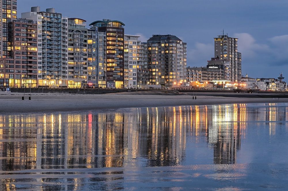 Erleben Sie die faszinierende Skyline von Vlissingen zur blauen Stunde, festgehalten in einem beeindruckenden Panorama. Dieses Bild wurde vom Meer aus aufgenommen und zeigt, wie sich die funkelnden Lichter der Stadt in einem dünnen Wasserfilm auf dem Sand spiegeln, der bei Ebbe die Küste bedeckt.