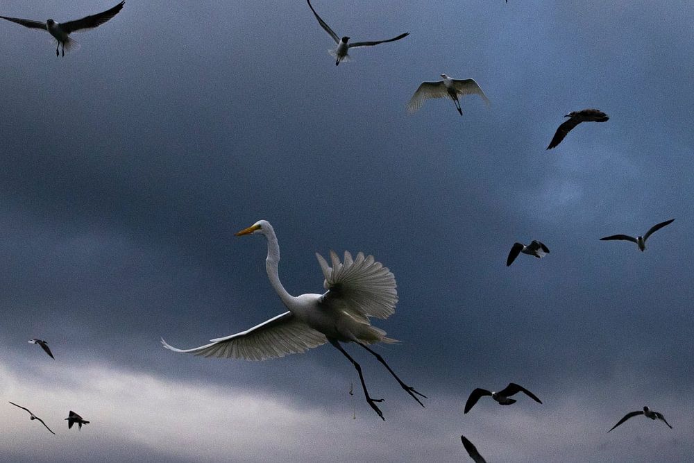 In Guatemala sind Silberreiher zu Fischern auf See geworden. Hier wurden Fische über Bord geworfen, und sie kommen, um ein Stück vom Kuchen abzubekommen. Der bedrohliche Himmel kündet von herannahenden Regenschauern.