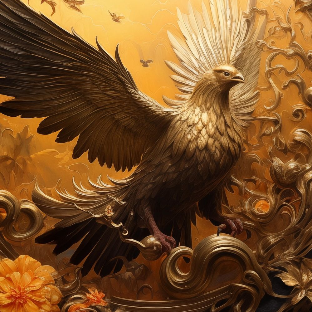 Einzigartiges Vogel-Gold mit Blumen - kreative Malerei im künstlerischen Stil. Mit schönen Farbtönen und einem einzigartigen Design ist dies ein stilvoller Fotodruck, der in jedem Raum gut aussieht.