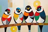 Vogelgemälde | Vogelquartett – Dieses verspielte Gemälde bringt mit vier stilisierten Vögeln auf einem Ast einen Hauch von Fröhlichkeit. Die klaren und lebendigen Farben sind verspielt und gleichzeitig modern, wobei die Primärfarben Rot, Blau und Gelb sofort ins Auge fallen und durch neutrale Hintergrundtöne ausgeglichen werden. Die…