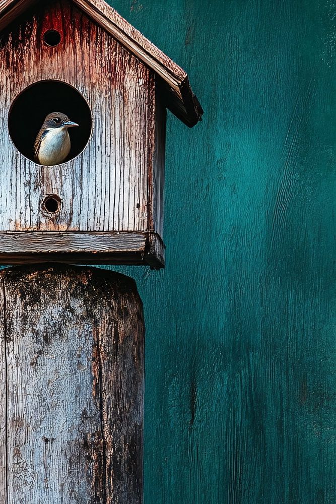 Ein rustikales Vogelhaus aus Holz, perfekt für Naturliebhaber. Das Häuschen steht auf einem verwitterten Holzpfosten vor einem grünen Hintergrund, was ihm einen ruhigen und einfachen Look verleiht. Der Vogel, der aus dem Häuschen schaut, ist ein charmantes und lebendiges Detail. Dieses Design ist ideal für alle, die einen Hauch von Natur in ihre Inneneinrichtung oder ihr Büro bringen wollen. Die kontrastierenden Farben sorgen für einen atemberaubenden visuellen Effekt, während das Design gleichzeitig beruhigend und einladend wirkt. Eine perfekte Wahl für alle, die minimalistische und von der Natur inspirierte Dekorationen lieben.