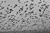 Schwarz-Weiß-Foto einer Gruppe von Staren, die von einem Möwenpaar gejagt werden. Der Himmel war plötzlich voller Vögel, die dieses, wie ich finde, künstlerische Bild erzeugten.