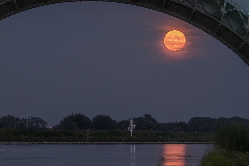 Wehr hagestein mit dem Aufgang des Vollmonds in den offenen Wehrbögen im Fluss lek. Es ist selten, dass diese Bögen in den Sommermonaten geöffnet sind. Dies ist auf den hohen Wasserstand nach den starken Regenfällen im Juli zurückzuführen.