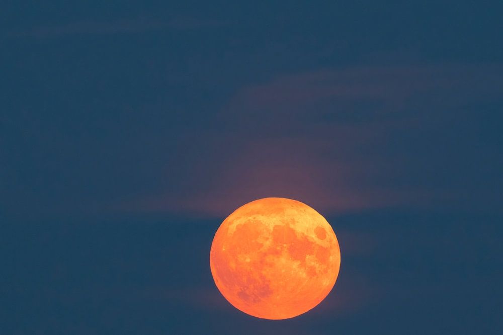 Vollmond in einer Sommernacht mit deutlich sichtbarer Mondoberfläche und Wolken, die vor dem orangefarbenen Mond vorbeiziehen. Aufgenommen mit einem langen Teleobjektiv.