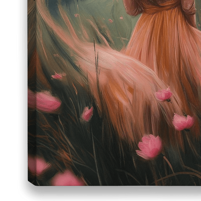 Das Kunstwerk zeigt eine Frau mit langen, wallenden Haaren, die ein luftiges Kleid trägt, das sich in den Windböen bewegt, während sie inmitten einer bunten Blumenwiese steht. Die ruhige Umgebung und die Bewegung erzeugen ein Gefühl von Freiheit, Harmonie und Verbundenheit mit der Natur.