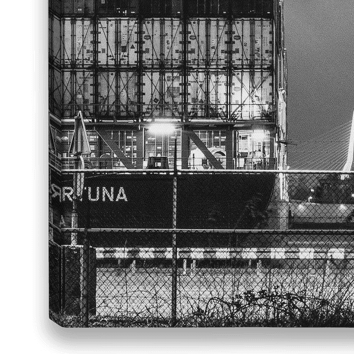Schwarzweißes Nachtfoto vom Containerterminal des Waalhavens mit Zollbeamten, Rotterdam.