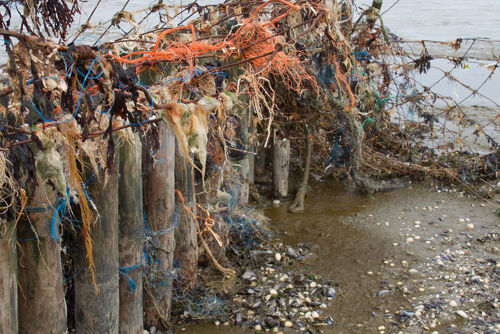 De zee en de wind zorgen ervoor dat er van alles aan de houten palen en het hekwerk blijft hangen