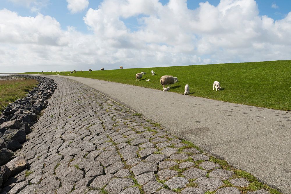 Waddenzee dijk op het eiland Terschelling met fietspad en grazende schapen en lammetjes