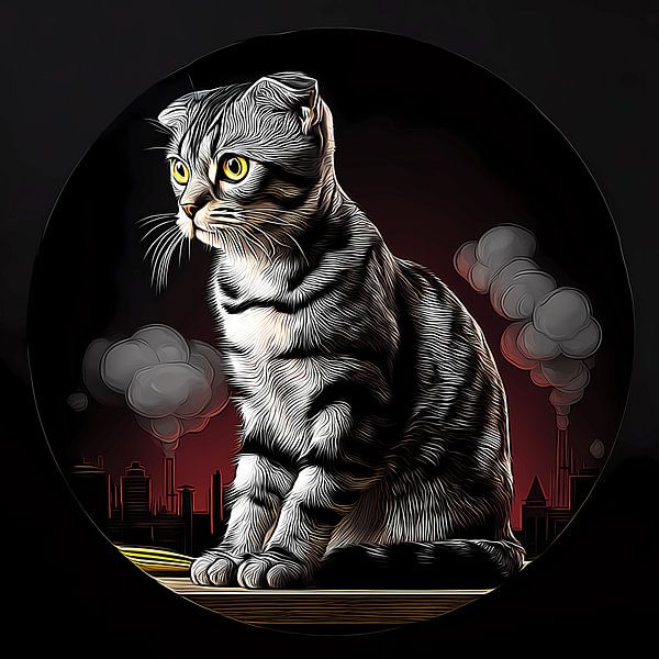 In stiller Wachsamkeit thront eine silbergestreifte Katze und beobachtet eine Stadt, die in Rauch und Schatten gehüllt ist. Hinter ihr ragen Fabrikhochhäuser gegen einen dunkelroten Himmel empor, deren Schornsteine Wolken ausstoßen, die über die industrielle Skyline ziehen. Die leuchtend goldenen Augen der Katze durchdringen die…
