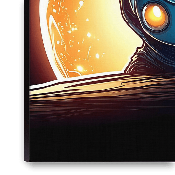 "Wächter des leuchtenden Schleiers" fängt den Moment der kosmischen Stille ein, wenn Stille auf Sternenlicht trifft. Dieser jenseitige Wächter, in Schatten gehüllt und von einem supernova-hell leuchtenden Mond gekrönt, blickt mit glühenden Augen aus der Leere, die ganze Galaxien in sich zu tragen…
