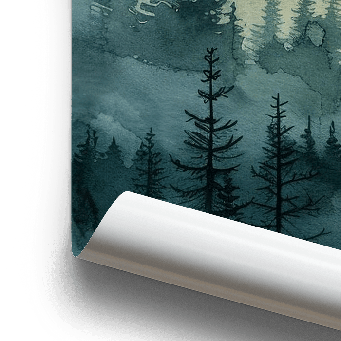 Dieses ruhige, kraftvolle Kunstwerk zeigt eine atemberaubende Aquarelllandschaft, die die geheimnisvolle und beruhigende Essenz eines Waldes bei Sonnenaufgang oder Sonnenuntergang einfängt.