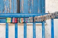 Viele alte Wäscheklammern sind an einer Wäscheleine aufgereiht draußen an einer blauen hölzernen Vintage Balkonbrüstung in einem griechischen Dorf auf einer Kykladeninsel in Griechenland.