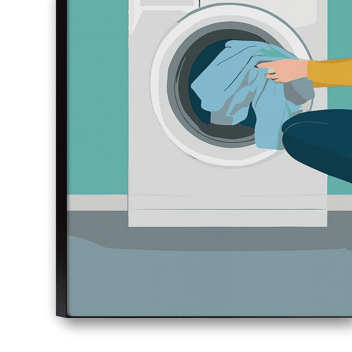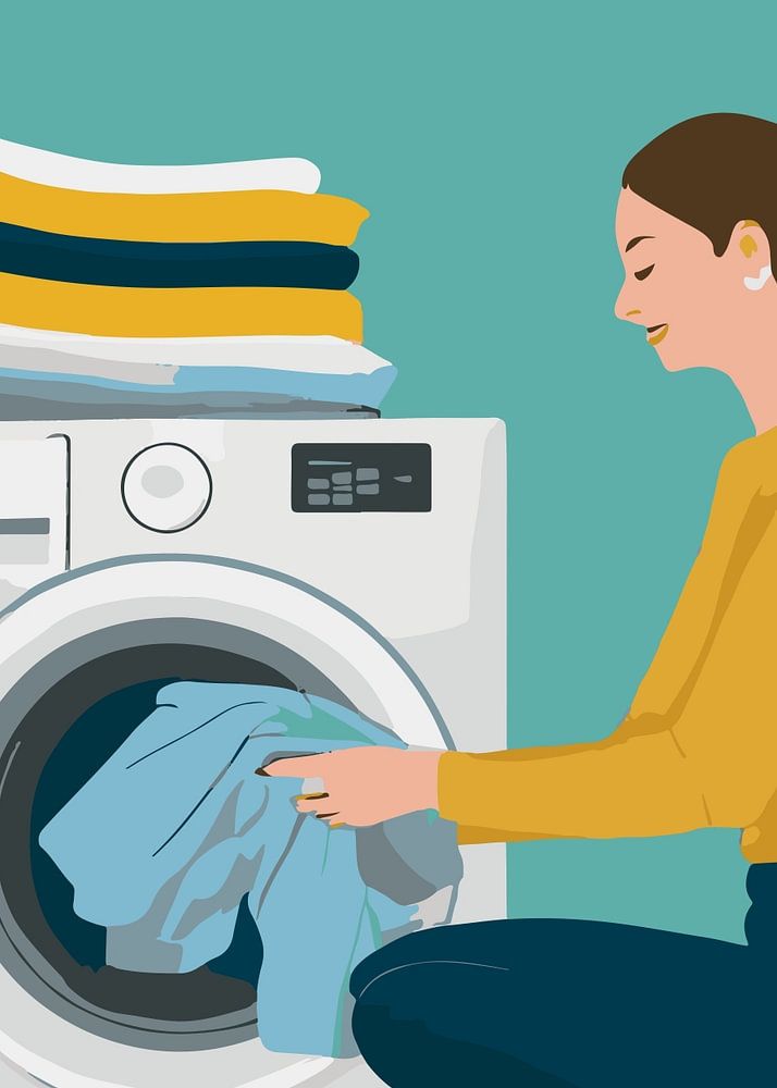 Eine illustrierte Vektor-Stil Malerei einer Frau Laden Wäsche in einer Waschmaschine. Das Bild ist in grau-grüner Farbe und hat den Titel "Laundry Day".