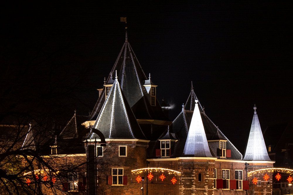 Die Waag am Nieuwmarkt in Amsterdam stammt aus dem 15. Jahrhundert und war ursprünglich ein Stadttor. An diesem Abend ist die Wiegehalle wunderschön beleuchtet.
