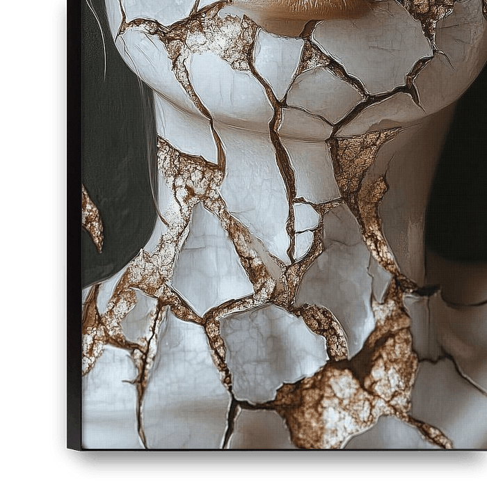 Eine weiße Körperskulptur mit goldenen Rissen, gebrochen und repariert durch goldenes Material, ein schönes Frauengesicht mit geschlossenen Augen, weißer Hautfarbe und perfekten Gesichtszügen, ein schwarzer Hintergrund, und die vordere Hälfte ist abgebrochen