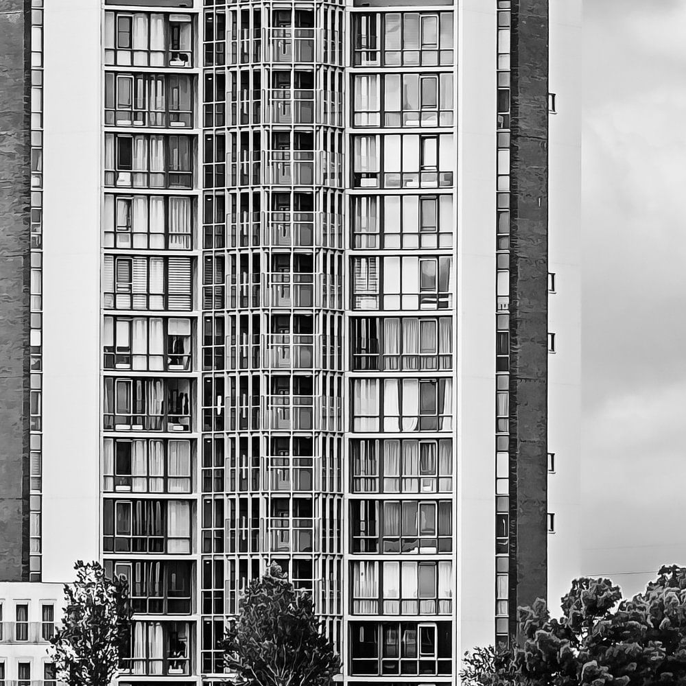 Digitales Schwarz-Weiß-Artwork des Landmark-Wohnturms, der sich am Bergse Plaat in Bergen op Zoom (Brabant) befindet.
