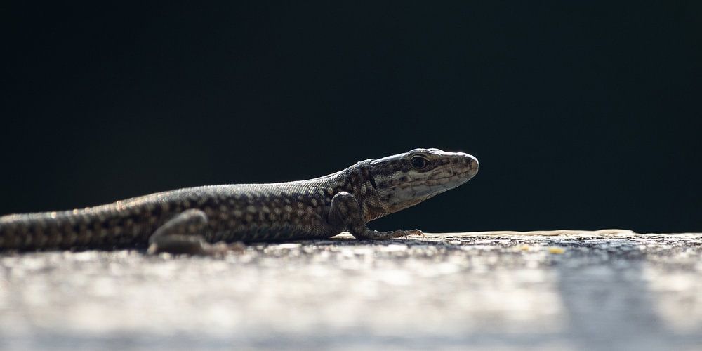 Die Waldeidechse auch Bergeidechse oder Mooreidechse genannt (Zootoca vivipara, früher Lacerta vivipara) sonnt sich in der frühen Morgensonne. Ihre schuppige Haut glänzt im Sonnenlicht vor einem dunklen Hintergrund. Dieses kleine Reptil ist in ganz Nordeuropa verbreitet und hat meist eine braun gemusterte Haut.