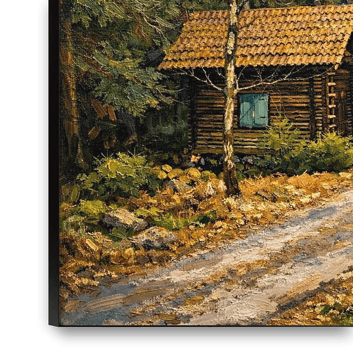 Dieses Motiv zeigt eine abgelegene, rustikale Holzhütte inmitten eines dichten Nadelwaldes. Ein geschwungener Kiesweg führt am Gebäude vorbei und lenkt den Blick in die Tiefe der Landschaft. Warmes, gefiltertes Sonnenlicht durchdringt die Baumkronen und taucht die Szene in goldene Nuancen. Die Darstellung in Ölgemälde-Optik mit…