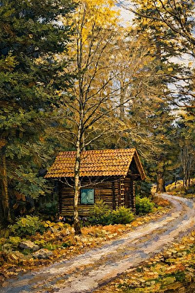 Bestelle das digitale Kunst Bild Waldhütte am stillen Forstweg von Design by Ricki als Reproduktion auf Leinwand, Alu-Dibond, als Poster, Fototapete oder Acrylglasbild.