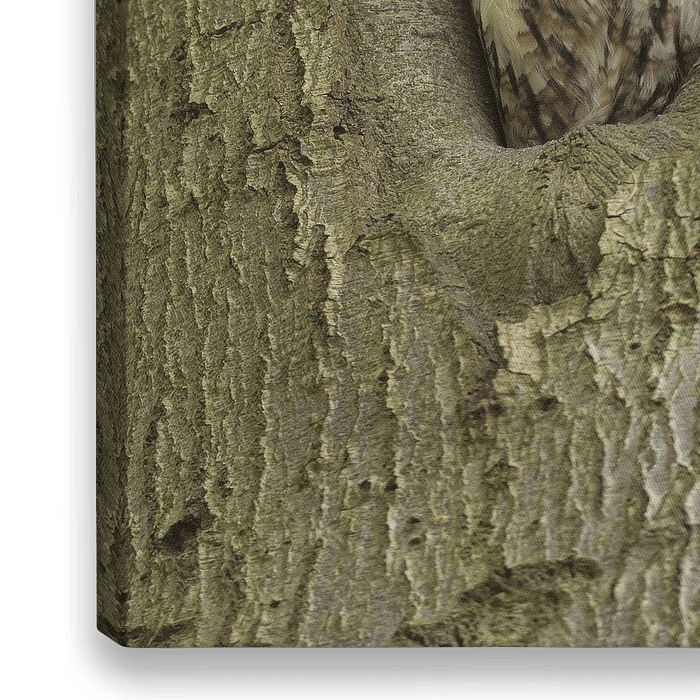 Waldkauz sitzt in seinem Baum in seinem Nest und schaut den Fotografen mit halb geöffneten Augen sorgfältig an.