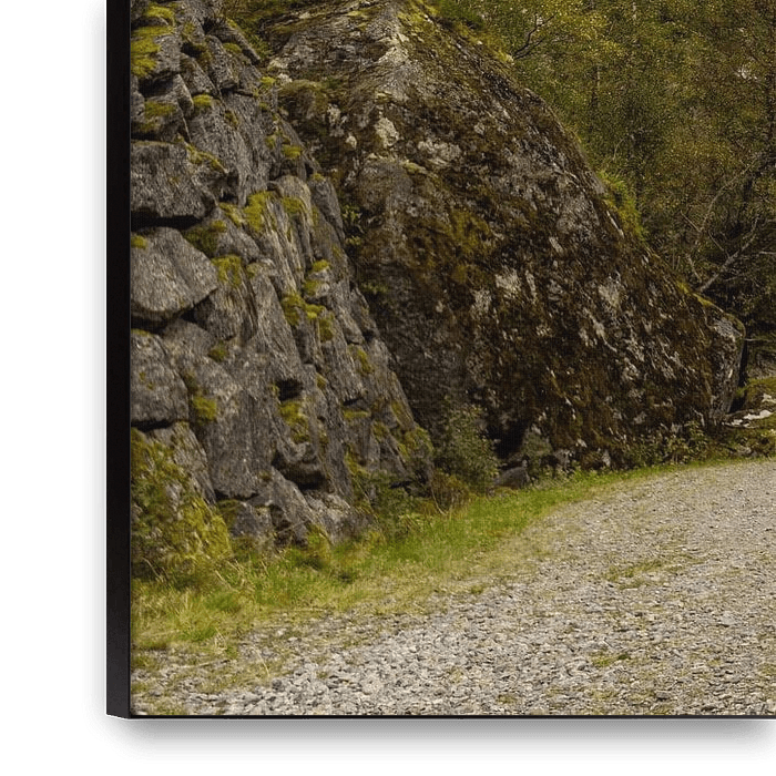Zwischen hohen Steinwänden und Grün öffnet sich ein Tal. Die Straße schlängelt sich ruhig durch die Landschaft und lenkt den Blick in die Ferne, wo sich die Berge Schicht für Schicht auftürmen. Die Komposition ist offen und einladend: Vorder-, Mittel- und Hintergrund greifen ineinander und verleihen dem Bild Tiefe und Maßstab.