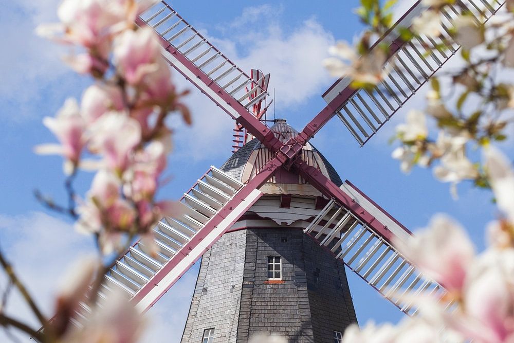 Herdentorswallmühle in den Wallanlagen mit Magnolienblüte , Bremen, Deutschland, Europa