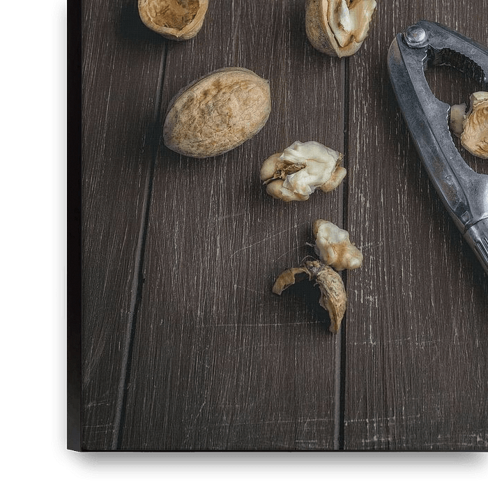 Bestelle das Foto Walnüsse mit einem Nussknacker von Edith Albuschat als Reproduktion auf Leinwand, Alu-Dibond, als Poster, Fototapete oder Acrylglasbild.