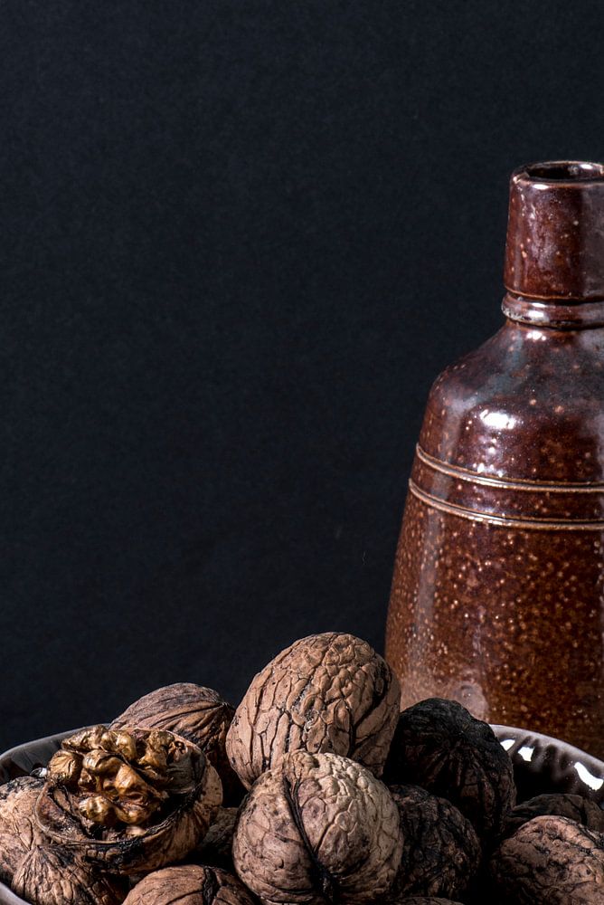 Stilleben mit Walnüssen und Steingutflasche